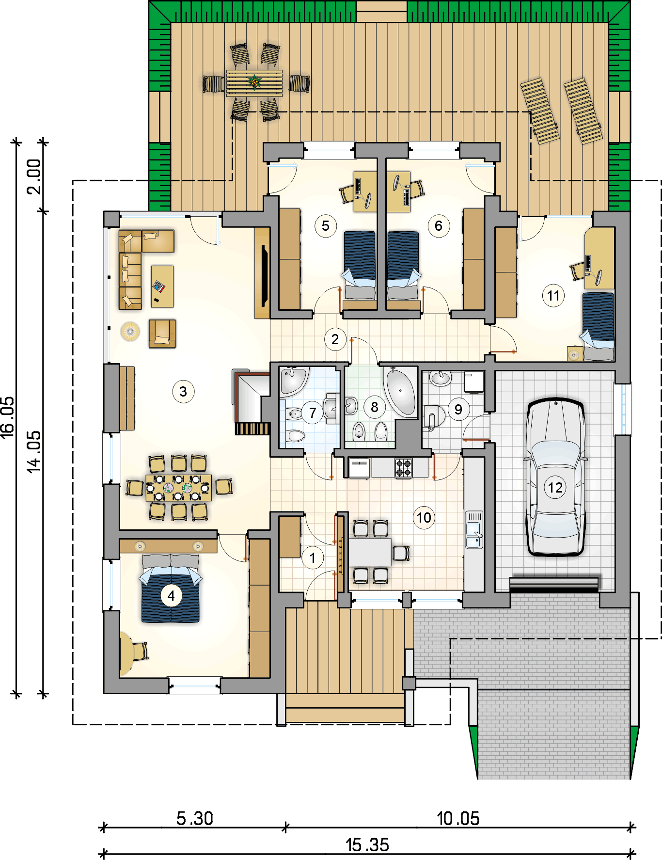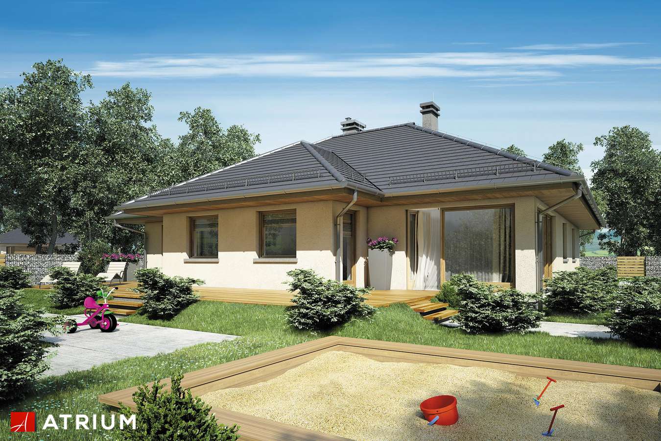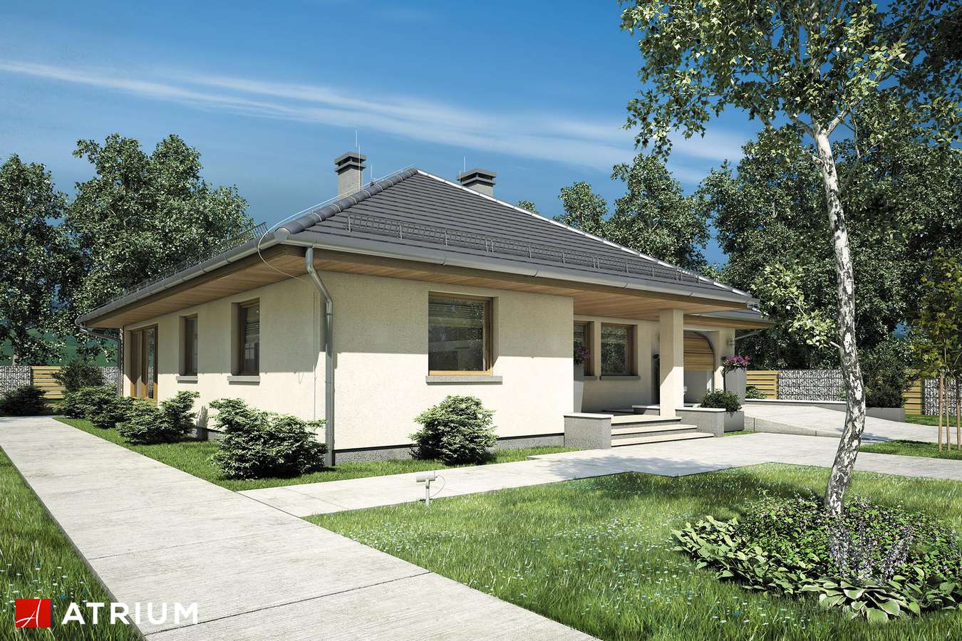 Prekrasna prizemna kuća s kosim krovom. Prostor za spavanje je u stražnjem dijelu kuće, tri velike sobe omogućit će miran odmor daleko od užurbane ulice, a veliki prozori i ostakljena vrata za izlaz na terasu u svakoj sobi osiguravaju bliski kontakt s vrtom koji okružuje kuću. Smještena u prednjem dijelu kuće, dodatna soba može se koristiti kao radna soba ili spavaća soba za goste. Tu je i veliki dnevni boravak s blagovaonicom i centralno smještenim kaminom. U prednjem djeu kuće nalazi se i velika kuhinja s prostorom za manji stol za jelo, koji se može koristiti svakodno za doručak ili večeru. Tijelo kuće uključuje i garažu za jedan automobil, kotlovnicu, predsoblje i dvije potpuno funkcionalne kupaonice: jedna služi noćnoj zoni, a druga dnevnoj zoni. Ova kuća srednje veličine privući će pažnju investitora koji cijene mir, praktična rješenja i udobnost, a njena će arhitektura lako funkcionirati kako među novim tako i postojećim zgradama.