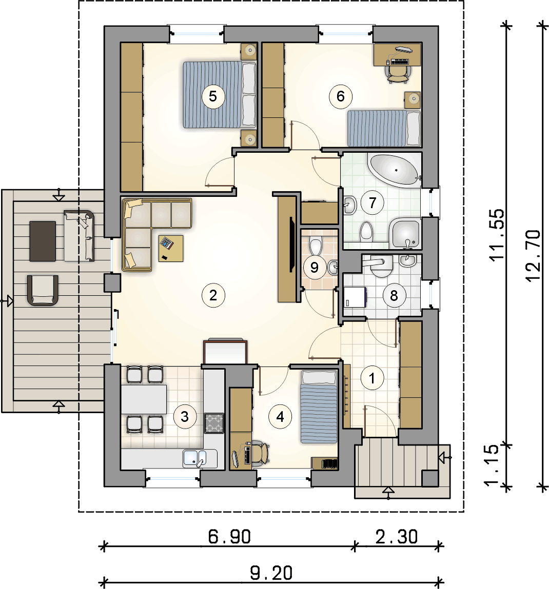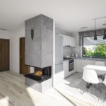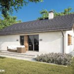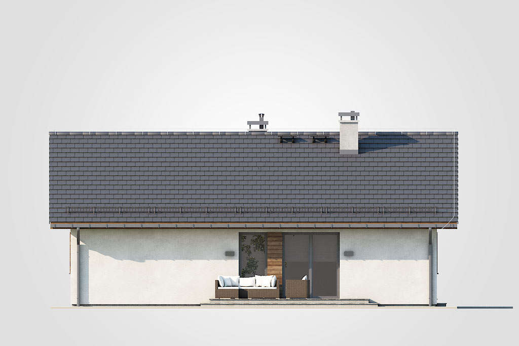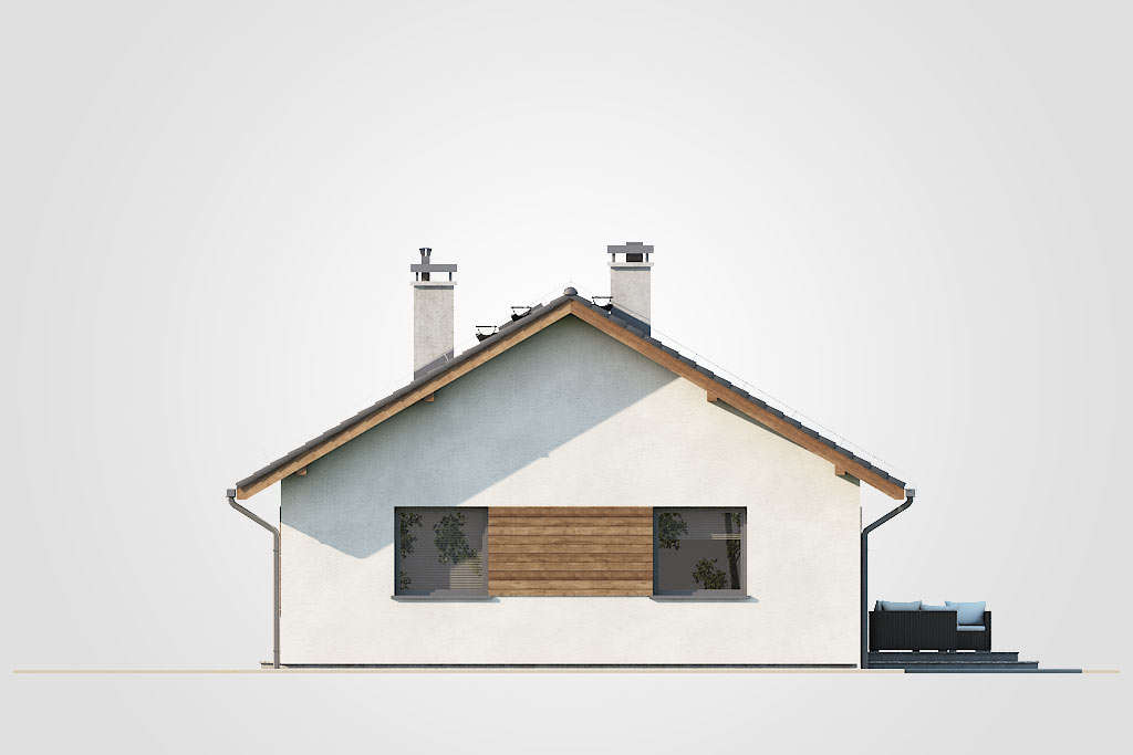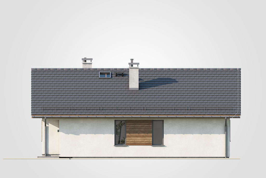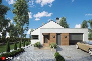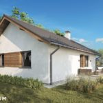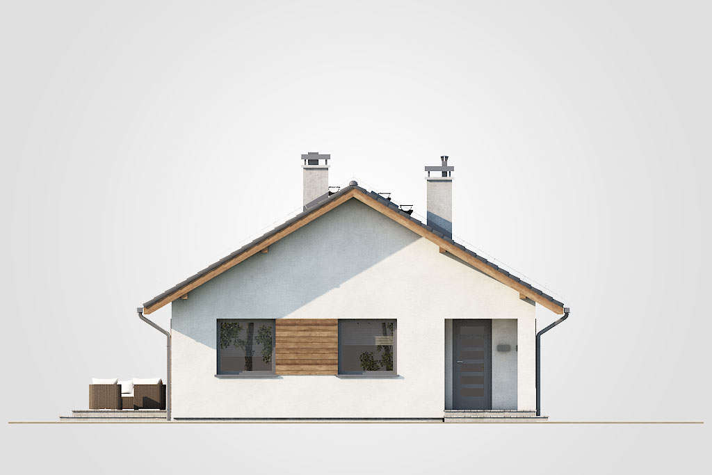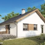 Mala, funkcionalna jednokatnica s klasičnim, jednostavnim blokom prekrivenim kosim krovom. Bijela žbuka u kombinaciji s grafitnim pločicama i suptilnim drvenim detaljima stvara skladnu cjelinu koja se dobro uklapa i u gradska i prigradska naselja. Zahvaljujući kompaktnom obliku, projekt je pogodan za provedbu na malim parcelama. Vanjska vrata zgrade dizajnirana su u arkadi. Kuća je pogodna za obitelj sa tri ili četri osobej. Središnje mjesto kuće je dnevni boravak sa kaminom i izlazom na bočnu terasu. S prednje strane dizajnirana je kuhinja i mala soba, koja može djelovati kao radna soba ili spavaća soba. Straga, u mirnijem dijelu kuće nalaze se dvije spavaće sobe. Prednost dizajna je jednostavan tlocrt tako da troškovi izrade i uporabe neće biti visoki.