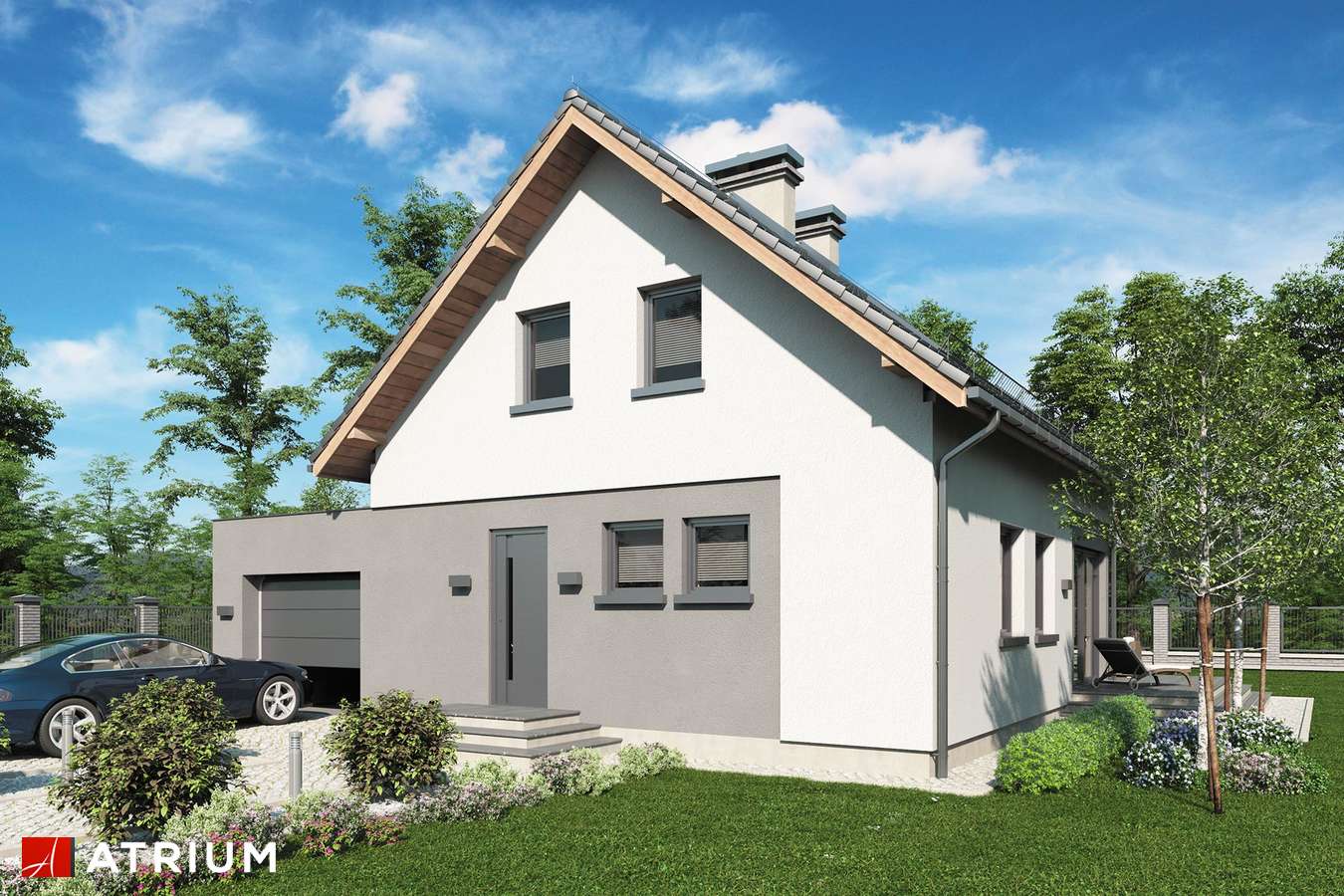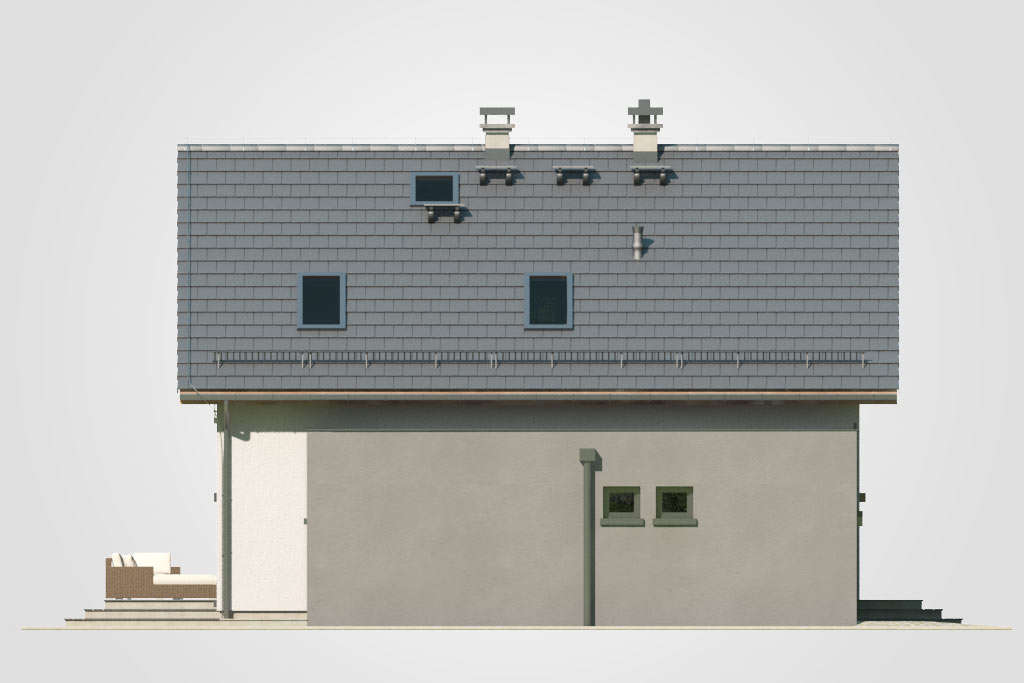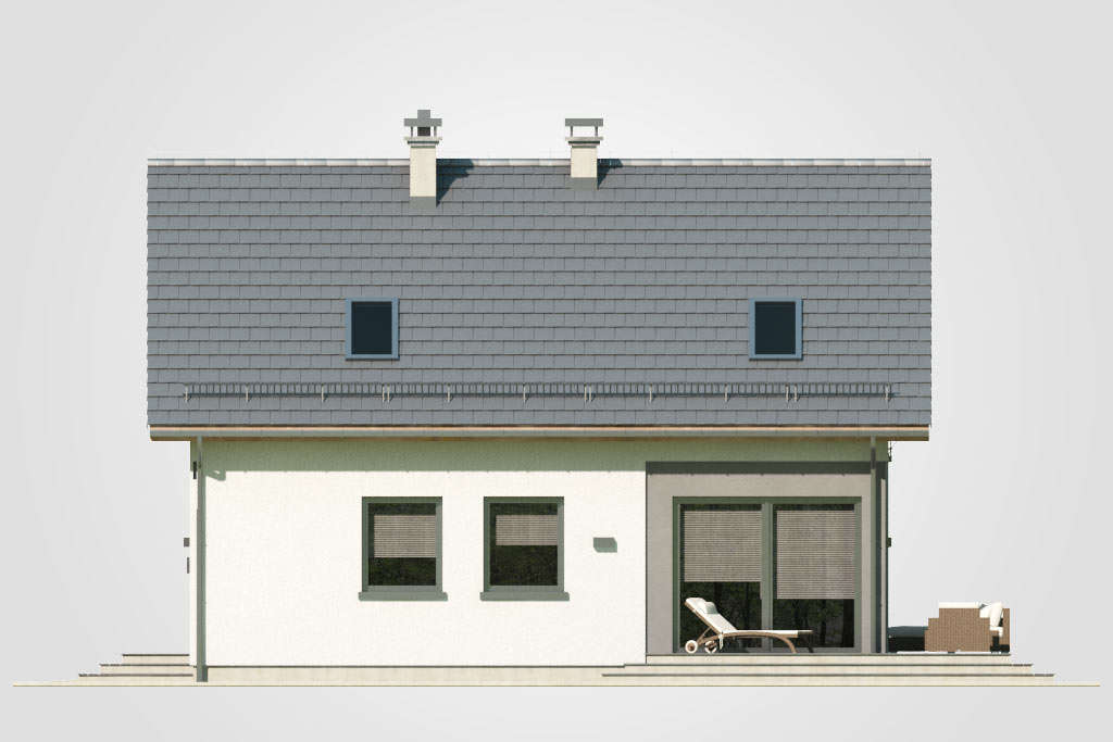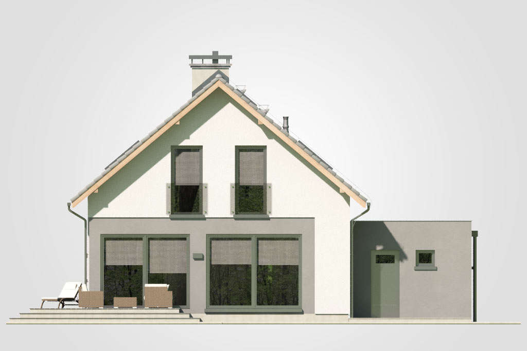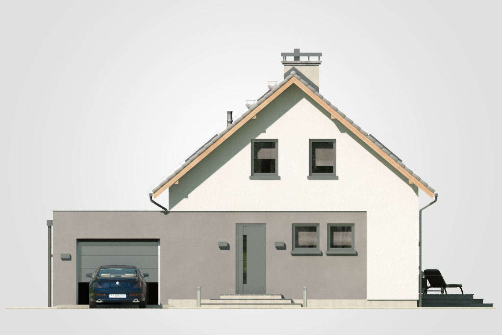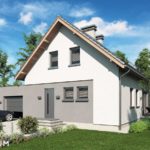 Predstavljamo jednu od verzija projekta Bravo – malu atraktivnu kuću s potkrovljem i garažom. Ova kuća sa kosim krovom bit će savršen odgovor za investitore koji traže projekte jeftine za realizaciju. Zanimljivo integrirana garaža s ravnim krovom daje cjelini izuzetan, moderan izgled. Iz garaže, iza koje se nalazi velika pomoćna prostorija, idemo do udobnog predsoblja, u koje se lako mogu ugraditi ormari. Plan prizemlja predviđa i kotlovnicu s mjestom za pranje rublja, veliki prolaz i svijetlo spremište, kupaonicu, stubište i naravno dnevni boravak s velikom udobnom blagovaonicom i kuhinjom. Zbog velike zastakljenosti dnevni boravak i blagovaonica bit će dobro osvijetljeni, zahvaljujući čemu će ove dvije najvažnije sobe u dnevnoj zoni poprimiti ugodan karakter, što će posebno u zimskom vremenu naglasiti vatra u kaminu. U potkrovlju se nalazi noćna zona za stanare, tri spavaće sobe s posebno dizajniranim udubljenjima za ormare, mogućnost uređenja malog odjeljka za odlaganje u komunikacijskom dijelu i velika kupaonica u koju se lako uklapa tuš-kabina i velika kada. Ova je kuća stoga sjajan prijedlog za četveročlanu obitelj koja traži funkcionalna rješenja i jednostavan, ali originalan izgled kuće iz snova.
