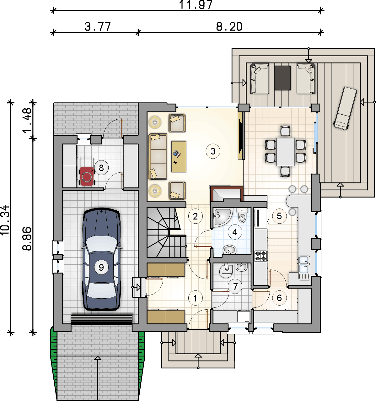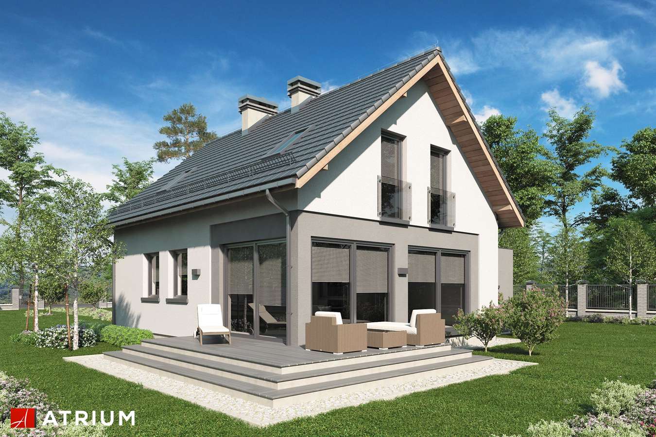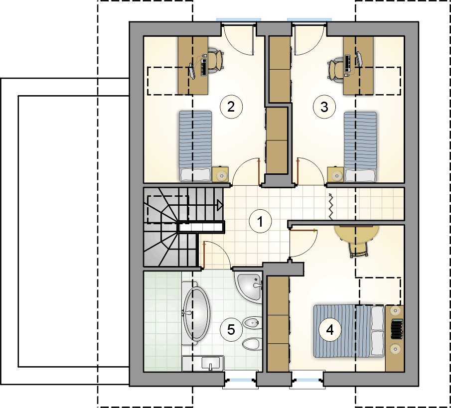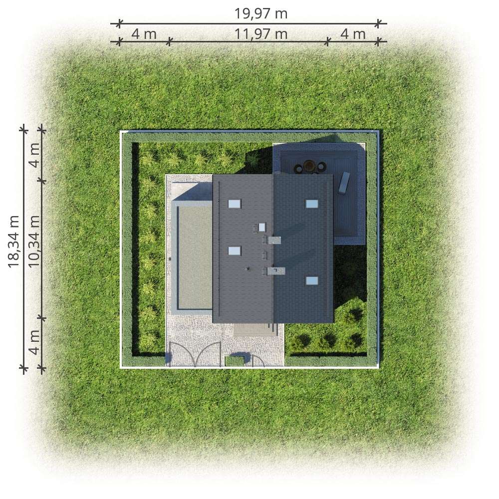 Predstavljamo jednu od verzija projekta Bravo – malu atraktivnu kuću s potkrovljem i garažom. Ova kuća sa kosim krovom bit će savršen odgovor za investitore koji traže projekte jeftine za realizaciju. Zanimljivo integrirana garaža s ravnim krovom daje cjelini izuzetan, moderan izgled. Iz garaže, iza koje se nalazi velika pomoćna prostorija, idemo do udobnog predsoblja, u koje se lako mogu ugraditi ormari. Plan prizemlja predviđa i kotlovnicu s mjestom za pranje rublja, veliki prolaz i svijetlo spremište, kupaonicu, stubište i naravno dnevni boravak s velikom udobnom blagovaonicom i kuhinjom. Zbog velike zastakljenosti dnevni boravak i blagovaonica bit će dobro osvijetljeni, zahvaljujući čemu će ove dvije najvažnije sobe u dnevnoj zoni poprimiti ugodan karakter, što će posebno u zimskom vremenu naglasiti vatra u kaminu. U potkrovlju se nalazi noćna zona za stanare, tri spavaće sobe s posebno dizajniranim udubljenjima za ormare, mogućnost uređenja malog odjeljka za odlaganje u komunikacijskom dijelu i velika kupaonica u koju se lako uklapa tuš-kabina i velika kada. Ova je kuća stoga sjajan prijedlog za četveročlanu obitelj koja traži funkcionalna rješenja i jednostavan, ali originalan izgled kuće iz snova.
