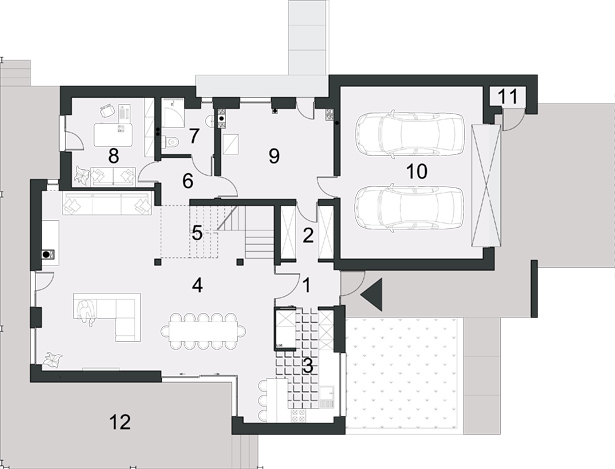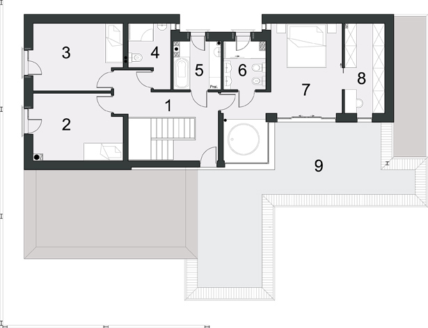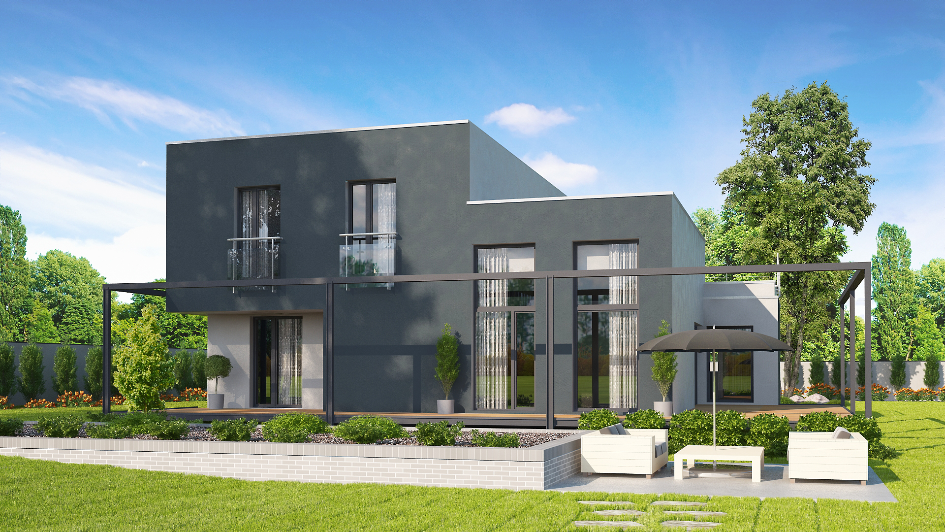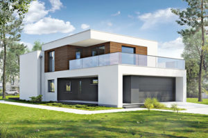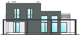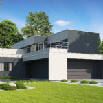 D1 ist ein modernes Haus mit einem Flachdach, interessanten Gebäudebau und geräumigen Terrassen. Es ist eine ideale Lösung für Menschen, die den Kontakt mit der Natur mögen und ein ideales Beispiel für eine Familie von 4 bis 5 Personen. Das funktionale Erscheinungsbild des Hauses trennt die Nachtzone vom Wohnbereich. Die Anordnung von Räumen und Kommunikationsleitungen ist immer eine individuelle Sache, die auf der Grundlage persönlicher Vorlieben bestimmt wird. In unserem Beispielprojekt bieten wir folgende Lösungen an: