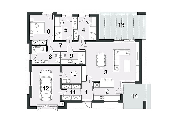Dnevni prostor, velika dnevna soba povezana z jedilnico in odprto kuhinjo. Iz dnevne sobe velika steklena vrata vodijo na teraso. Tudi v kuhinji so vrata, skozi katera lahko izstopite na manjšo, pokrito teraso, sanjski prostor za jutranjo kavo. Iz dnevne sobe gremo proti nočnemu prostoru. Nočni prostor ima tri spalnice in dve kopalnici. Razporeditev teh prostorov, njihove dimenzije in skupni videz lahko spremenite glede na vaše potrebe. Vse spalnice imajo visoka okna s pogledom na vrt. D11 je dizajn za ljudi, ki cenijo preprostost in funkcionalnost. Njegove majhne dimenzije bodo dobro delovale v urbanem razvoju. Če vam je bil ta dizajn všeč, vendar želite uporabiti svoje ideje – z veseljem ga bomo preoblikovali z vsemi vašimi potrebami.