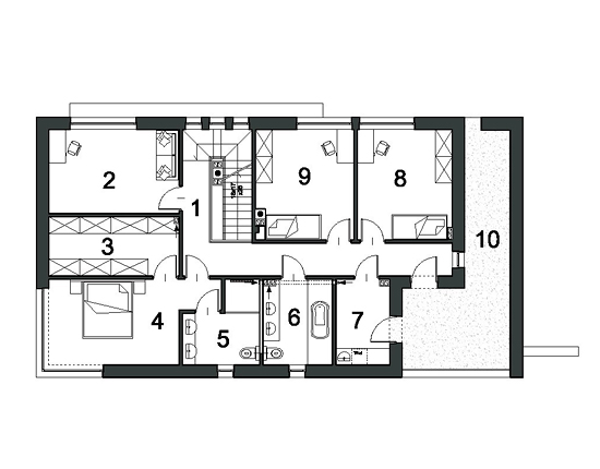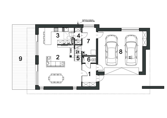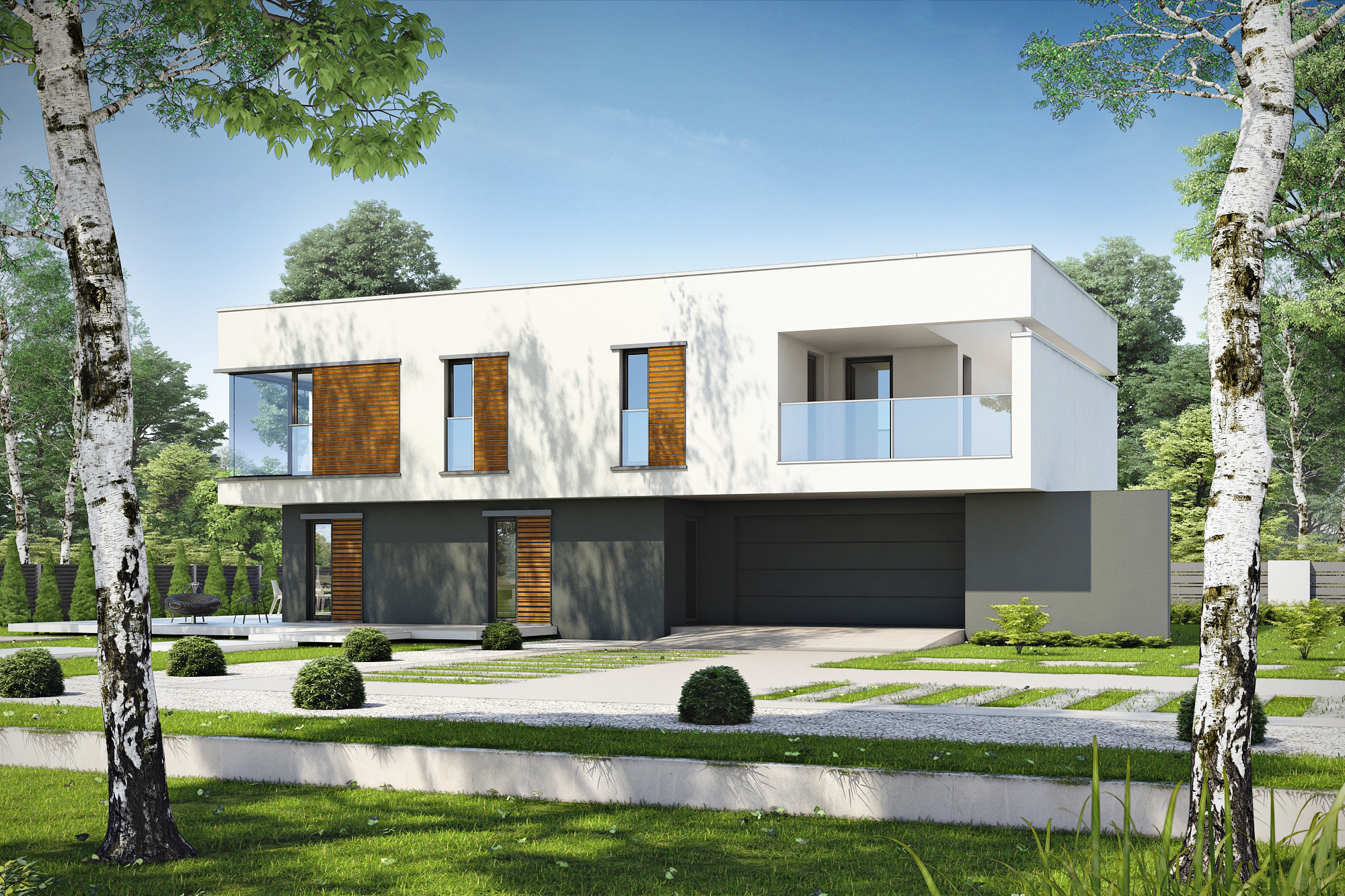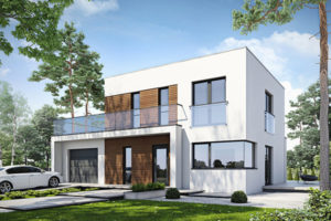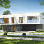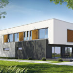 Det eleganta D24-huset är utformat för en större tomt med entré på fasadens längre sida, men att ändra ingångspositionen på den kortare sidan är inte ett problem, det handlar bara om att omforma garageporten. Interiören i huset: Låt oss börja med det funktionella utseendet på bottenvåningen, som skiljer sig från de andra stora öppna ytorna. En sådan lösning är till nytta för familjelivet, särskilt när det finns små barn hemma och de måste bevakas. Ett vardagsrum med öppen spis kombinerat med matplats och ett delvis öppet kök ger flexibilitet när det gäller dekoration. Öbord med stolar, som ligger i köket, är en extra plats att äta. Dessutom designade vi skafferiet på bottenvåningen, ett stort tekniskt rum och ett litet sanitetsområde med ingången från lobbyn. Garaget med två platser har ett höjdrum och två ingångar till klippbordet och lobbyn. Hela sittgruppen på bottenvåningen är perfekt upplyst tack vare glasrutan. Vi har alltid användbara skåp i foajén. Det finns fyra stora, bekväma sovrum på övervåningen. Det ena, det så kallade sovrummet, har en egen garderob och ett badrum som ger maximal integritet. Vad vi särskilt gillar med denna design är det stora hörnfönstret i detta sovrum. Det finns ett andra badrum och tvättstuga på första våningen, och en lång hall leder till den övre delvis täckta terrassen vilket är viktigt – det är direkt tillgängligt för alla i hushållet. Som vi nämnde vi – en kompakt, men ovanligt snygg och elegant design. Vi kombinerade de kalla färgerna – vitt och grått – med träets värme. Dessutom kännetecknas D24 av en omisskännlig stil som kombinerar moderna platta tak till glas och skuggning. Om du är intresserad av detta projekt, vänligen kontakta oss, vi svarar på alla frågor om dess funktionalitet, yttre utseende och eventuella förändringar som gör att vi bättre kan anpassa det till dina behov.