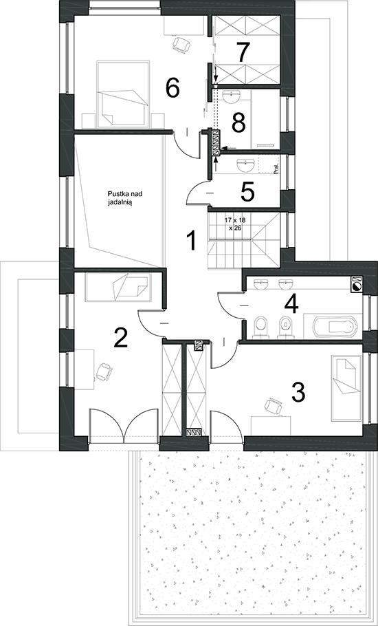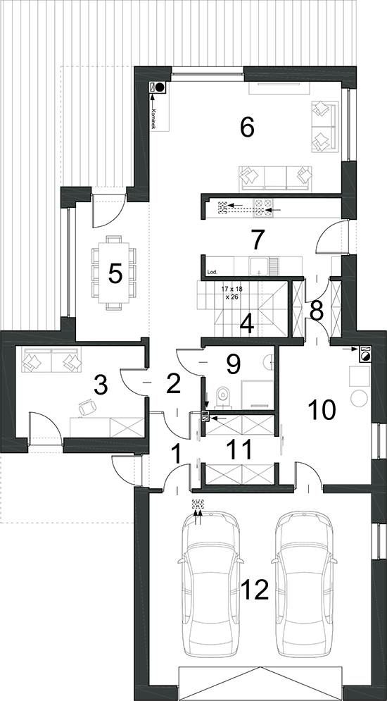Det är ett hus för mindre tomter, perfekt för en familj på fyra. Projektet är vårt förslag på intressanta och funktionella lösningar samtidigt som byggnadskroppens modernitet och elegans bibehålls. Men om du vill ändra något av elementen är vi redo att omforma huset tillsammans på basis av D29-projektet, men med dina personliga behov och preferenser i åtanke. D29 har några speciella lösningar som vi vill fästa er uppmärksamhet på. I bottenvåningens funktionella utseende föreslog vi två utgångar från garaget, en till det tekniska rummet och sedan genom skafferiet in i köket, som t.ex. Löser många problem med shopping. Den andra avfarten leder till korridoren där garderoben ligger. Den främre delen av köket fungerar som en arbetsplats, inte som ett dekorativt utrymme. Därför är vardagsrummet ett separat rum, endast avsett för vila, långt ifrån ljud från köket. Å andra sidan tillåter bristen på dörrar i köket fri rörelse till och från matsalen. Ett extra rum på bottenvåningen kan användas som en studie, datorrum eller ytterligare vardagsrum. På övervåningen designade vi ett utrymme som ger rummet mer ljus. Ett område är avsett för barn (två sovrum och ett badrum) och det andra för föräldrar (sovrummet kombinerat med en klädkammare och badrum). Zonerna är uppdelade med trappor och mycket användbara separerade från tvättstugan. När man tittar på byggnadens fönster är det svårt att få intrycket att huset är “smalt”, vilket är berömvärt med sammankopplade bågar och många förseningar. Utåt är huset balanserat, men berövat inte intressant form. Om du är intresserad av detta projekt, tveka inte att kontakta oss för att ge dig information om vårt erbjudande.