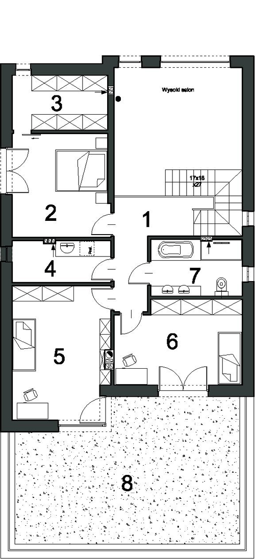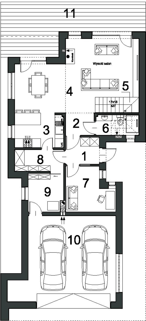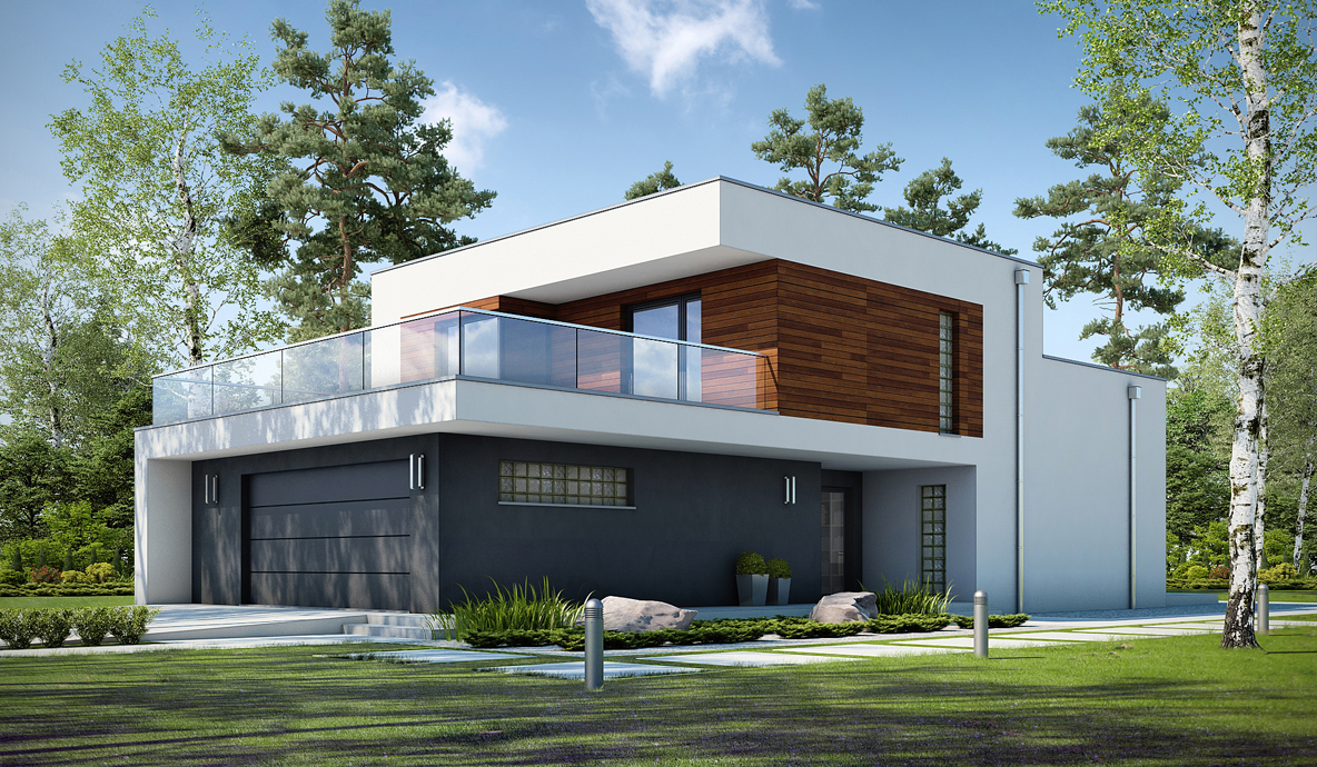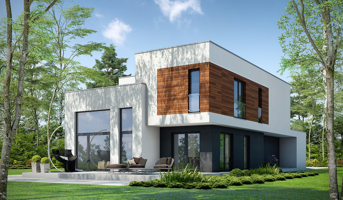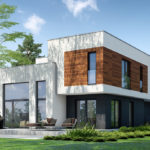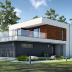 Här har vi designat ett hus som är försett med ett platt tak, en intressant form och en funktionell inredning. D31 är avsedd för en smal tomt, så den kännetecknas också av en långsträckt kropp. Huset är rymligt och stort, i en modern stil med den dolda färgen på fasaden i vitt och grått och med den visuella värmen från detaljer i trä. Huset är helt upplyst med dagsljus genom de stora fönstren, särskilt i vardagsrummet och matsalen, som leder till den rymliga uteserveringen. Det finns också en terrass på övre plan som nås från sovrummen. En mycket praktisk lösning är det naturliga taket i huvudentrén. Det finns tre ingångar på bottenvåningen, där ett rum kan användas som ett extra sovrum, gästrum, arbetsrum eller förråd, ett teknikrum, en hall och vardagsrummet i anslutning till matplatsen. I den centrala delen av bottenvåningen, bredvid badrummet, finns trappan till övre plan. Köket är delvis öppet mot matsalen. Det finns en öppen spis i vardagsrummet. Andra våningen består av tre sovrum: master bedroom (med en rymlig separat garderob) och två mindre sovrum med tillgång till terrassen. Ett badrum sparade lite utrymme som vi använde för tvättstugan. Från hallen på andra våningen kan du se vardagsrummet, tack vare glasräcket. Det ger en känsla av utrymme och öppenhet. Om du gillar detta hus tar vi gärna en diskussion för att skräddarsy ditt nya hem.