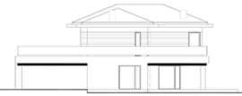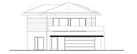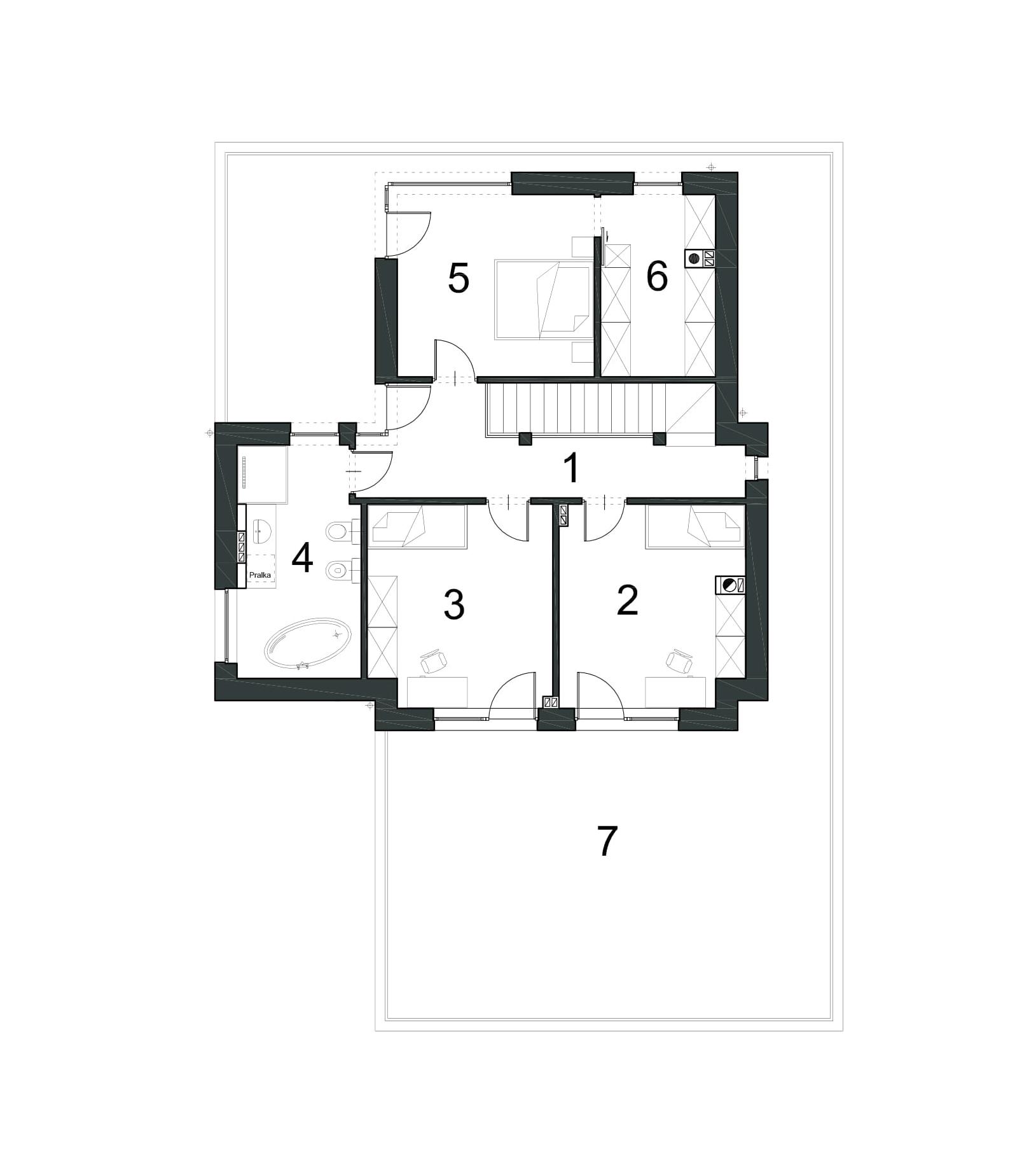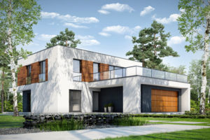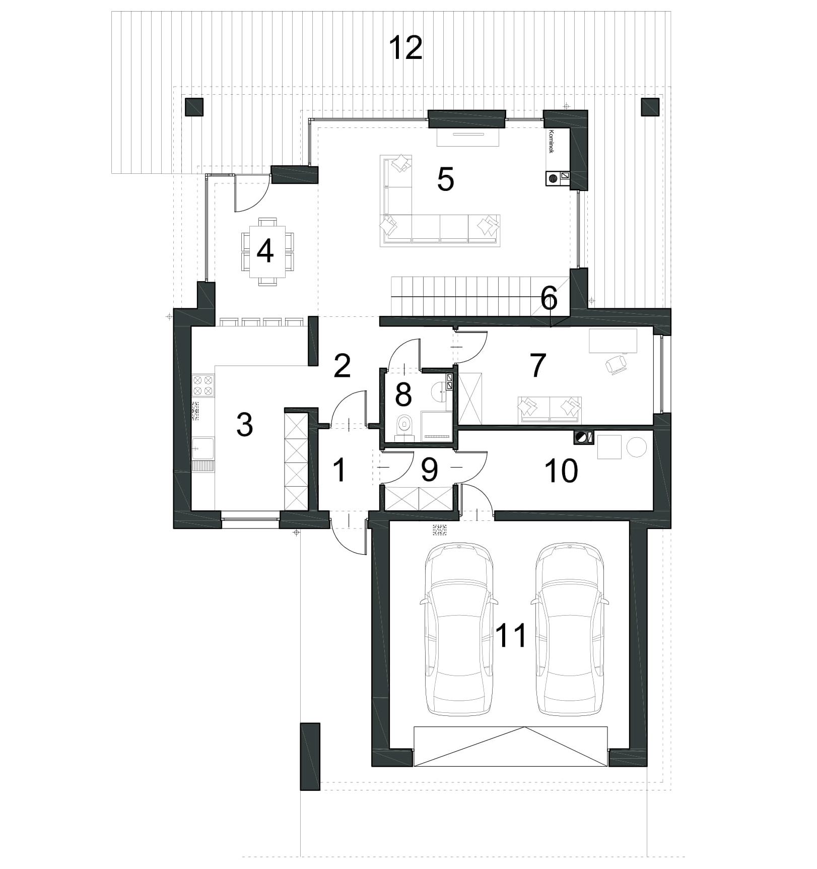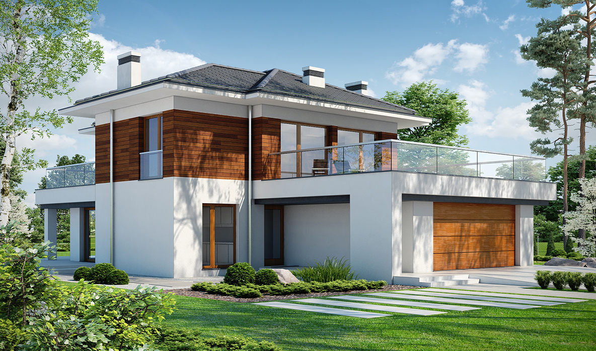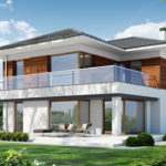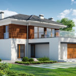 Der Eingang zum Haus ist zentral gelegen, dank dem der Durchgang von der Garage sehr einfach ist. Im Rest des Hauses gibt es eine separate Küche, Esszimmer kombiniert mit einem geräumigen Wohnzimmer mit Kamin und Treppe, Bad und zusätzlichen Platz. Vom Wohnzimmer können Sie zu einer großen Holzterrasse (teilweise überdacht) verlassen, diese Zone ist auch gut durch große Verglasung beleuchtet. Im ersten Stock haben wir eine Nachtzone entworfen – drei Schlafzimmer, darunter ein Doppelzimmer mit separatem Ankleidezimmer. Großes Badezimmer (fast 11 m²) bietet die Möglichkeit, eine Waschmaschine und sogar einen Trockner einzusetzen. Alle Zimmer im ersten Stock haben Zugang zur Terrasse, die das Haus von allen Seiten umgibt. Die Empfehlung für die Fassade des Hauses ist weißer Putz, graue Sandkleidung (einschließlich des Daches) mit Details in Holzpaneelen.
