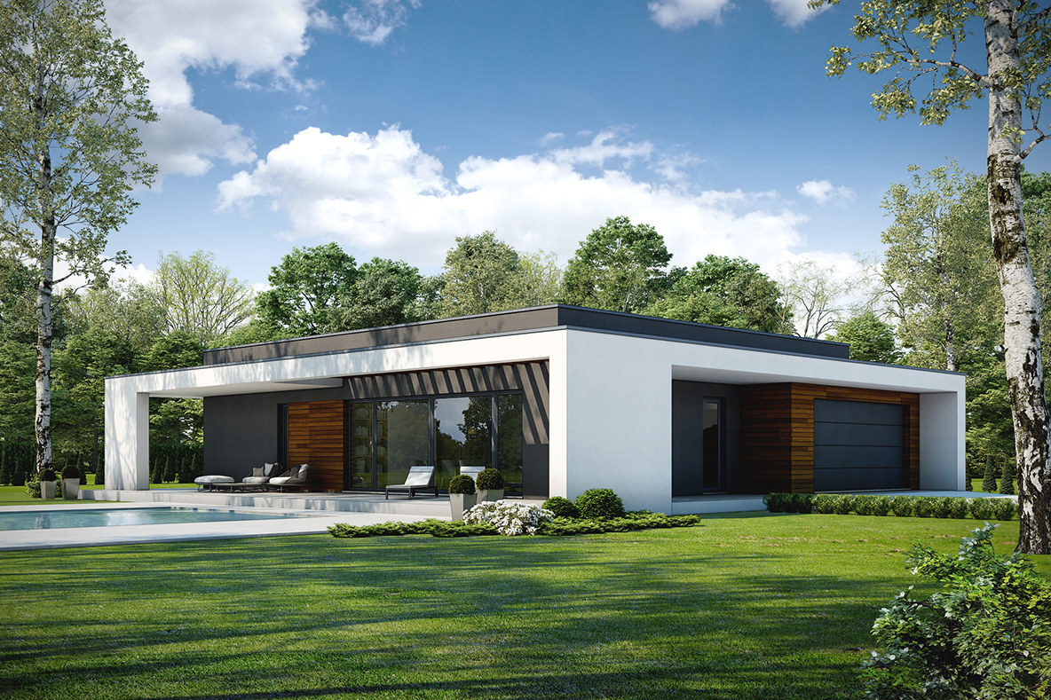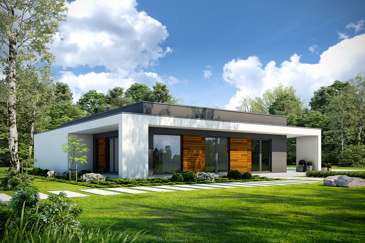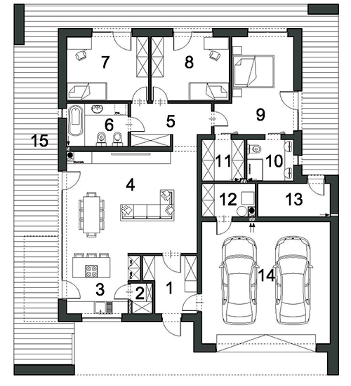 D42 är huset som kännetecknas av den enkla grå och vita fasaden med moderna träinslag. Husets interiör är funktionell och praktisk, uppdelad i tre zoner. Vardagsrummet har en öppen planlösning tillsammans med köket. Köket har även ett skafferi i ett separat rum. Vardagsrummet har en öppen spis som är perfekt för kyligare kvällar och även en utgång till terrassen. Sovrumsdelen består av tre rum varav ett större rum med separat badrum och en walk-in-closet. Det finns ett dubbelgarage för två bilar i anslutning till huset, samt ett teknikrum. Vår tanke med ett anslutande garage är att du ska slippa gå utomhus när du har parkerat bilen. Enkelt och bekvämt. De stora glaspartierna i vardagsrummet ger ett naturligt starkt ljus med en utsikt över trädgården. Dessutom har varje sovrum en egen utgång till husets generösa terrass.