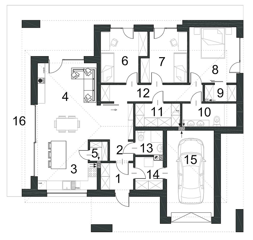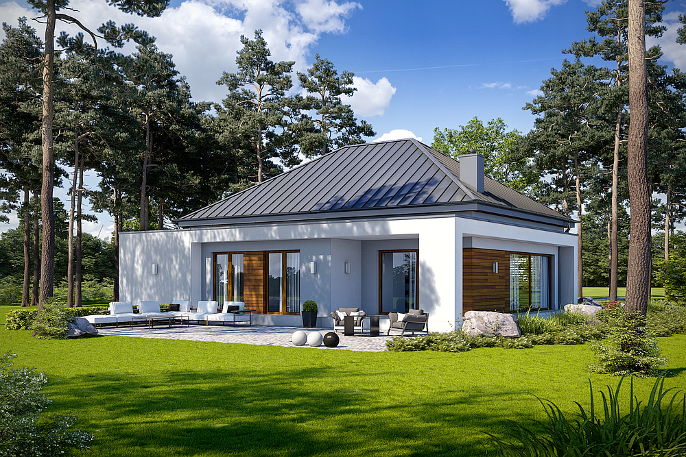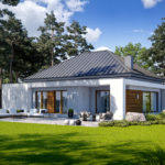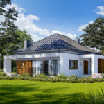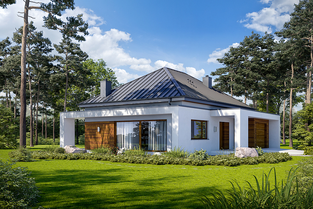 Das Interesse des Hauses D48 ist, dass dieses Haus zu einem typischen Trendstil gehört. Es ein Haus im Erdgeschoss mit Platz für ein Auto in der Garage und mit einem klassischen Dach. Auf einer kleinen Fläche, von etwas weniger als 100 m², sind alle notwendigen Zimmer für eine typische Familie von 2 + 2 platziert. Seine quadratische Form wird aufgrund kleiner Abmessungen in viele verfügbare Marktparzellen passen. Das Wohnzimmer, das mit einem Essbereich verbunden ist, wird viele Menschen fesseln, es verleiht dem ganzen Haus Charme. Eine interessante Fassade ist auch im Geiste der aktuellen Trends im Bauwesen vorhanden. Es ist eine Kombination aus Grau mit einem hölzernen Akzent.