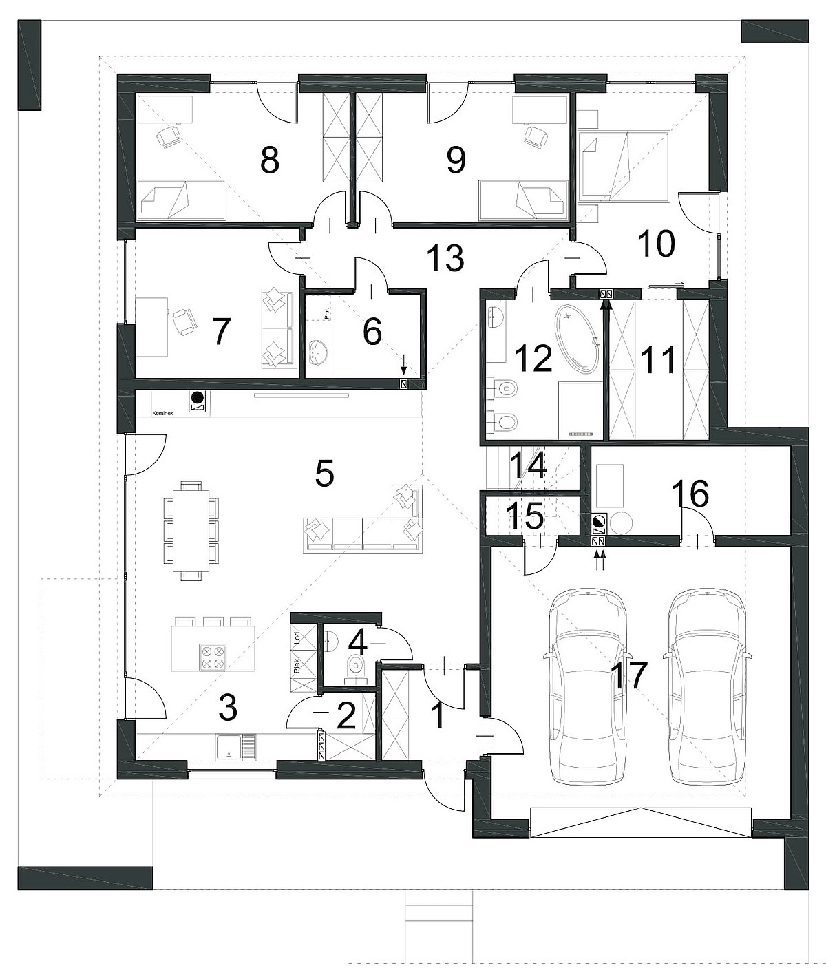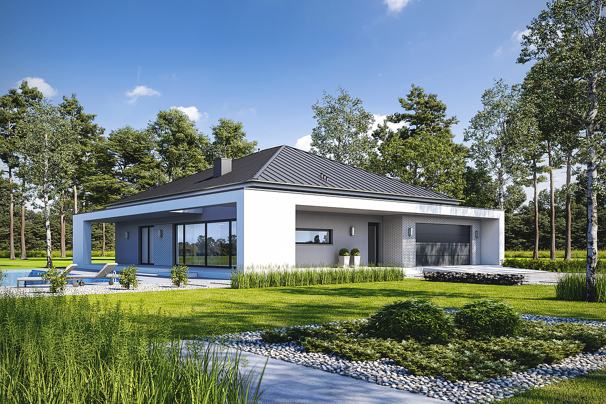 Om du gillar hus designade i moderna byggtrender, bjuder vi in dig till att bekanta dig med designen av hus D56. Detta hus har en användbar yta på 150 m² och är gjord för en familj med flera medlemmar. Fasaden är gjord i en proportionell, rektangulär plan i modern stil i vitt, grått och med flera tegelinsatser. Huset har ett graffittak. Det är bara början på hur många fördelar denna hemdesign har. Vi är övertygade om att det kommer att vinna ditt hjärta!