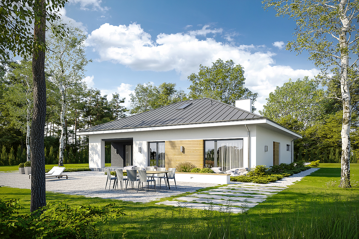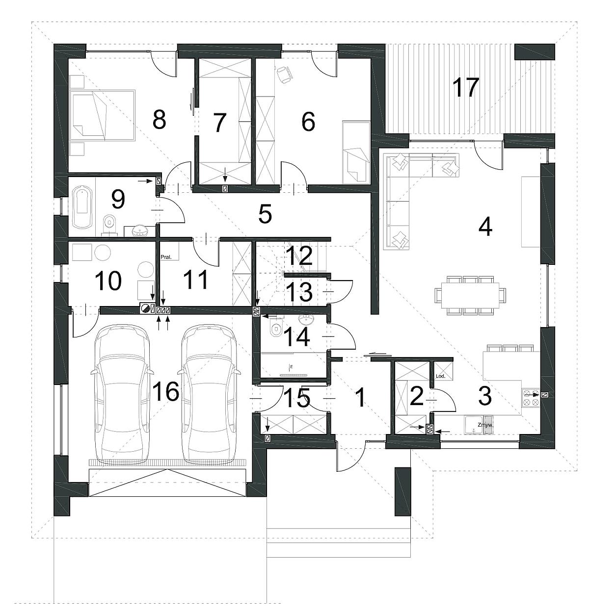 Je zelo priročna rešitev, ki olajša vsakodnevno delovanje, ko iz parkiranega avtomobila pripeljemo živila ali kovčke. Ko zapustimo preddverje, gremo v dnevno sobo, ki se nahaja nekoliko ob strani hiše. V D62 sta dnevna in nočna cona hiše jasno ločeni. Zahvaljujoč takšnim rešitvam lahko družinam zagotovimo maksimalno udobje življenja. Pri vstopu v hodnik hiše na levi strani je kopalnica in prostor za stopnice, ki vodijo na podstrešje. Nadalje skozi hodnik gremo v nočni del, kjer sta dve spalnici. Ena izmed njih je soba v kombinaciji z garderobo, ki lahko služi kot spalnica staršev.