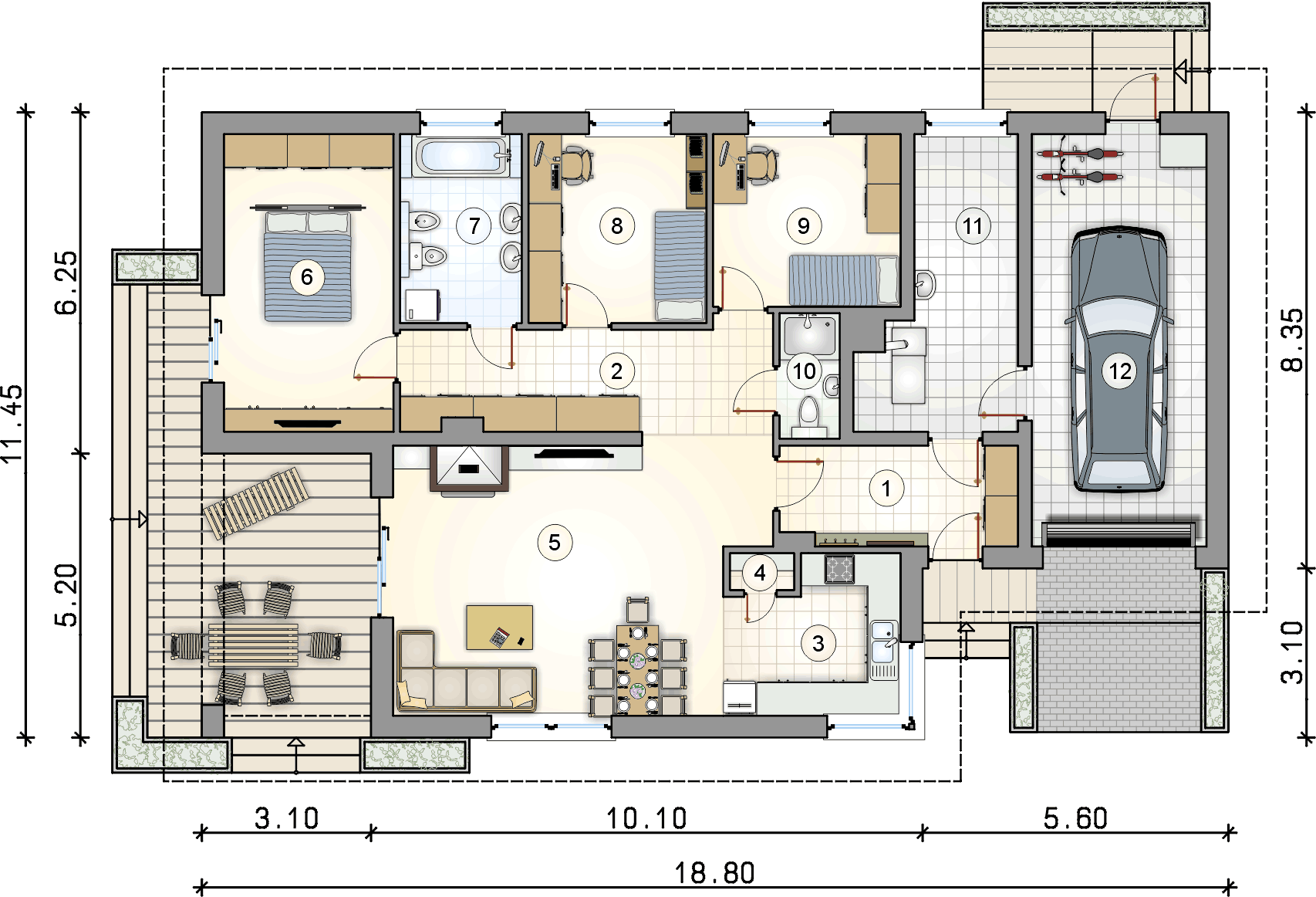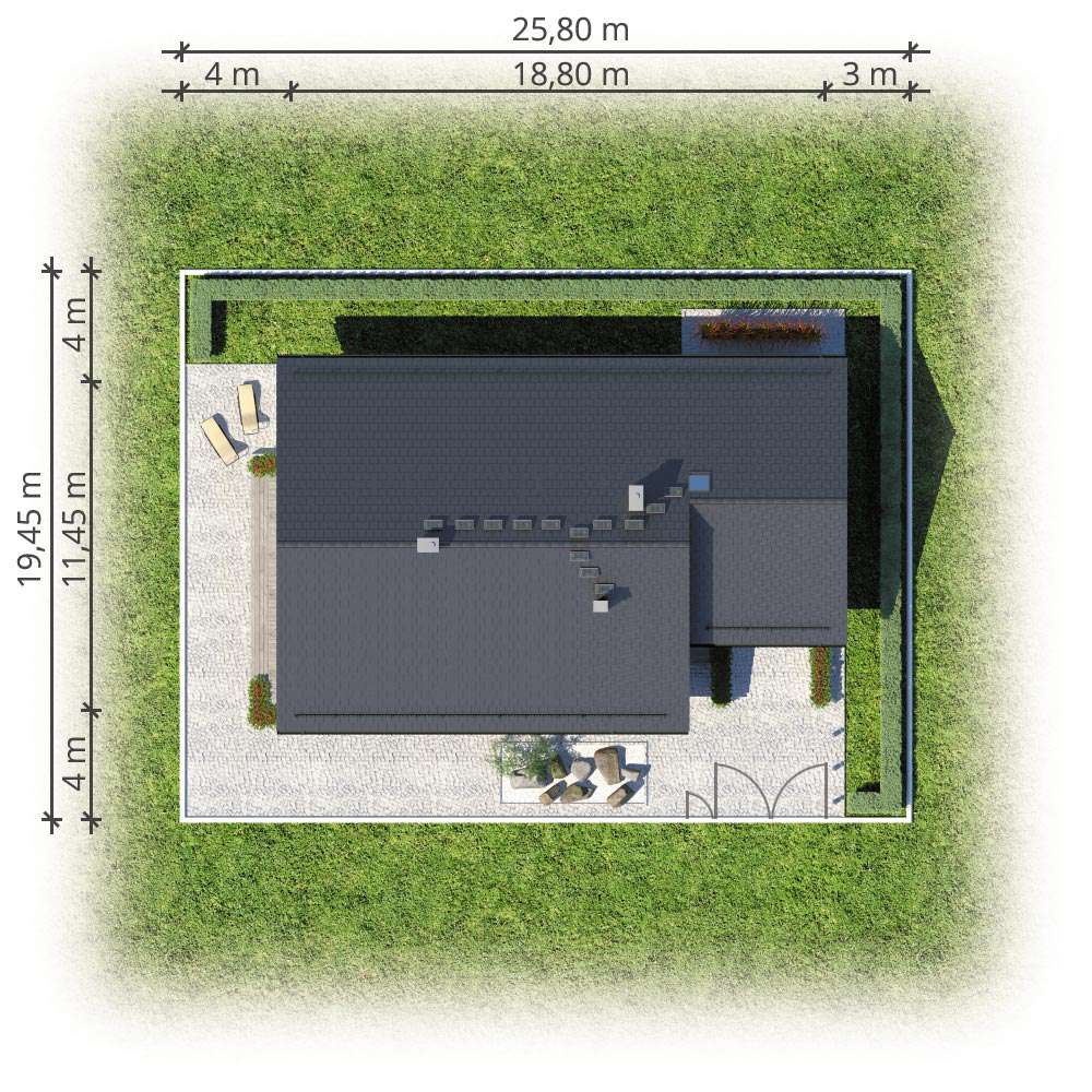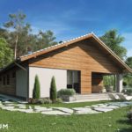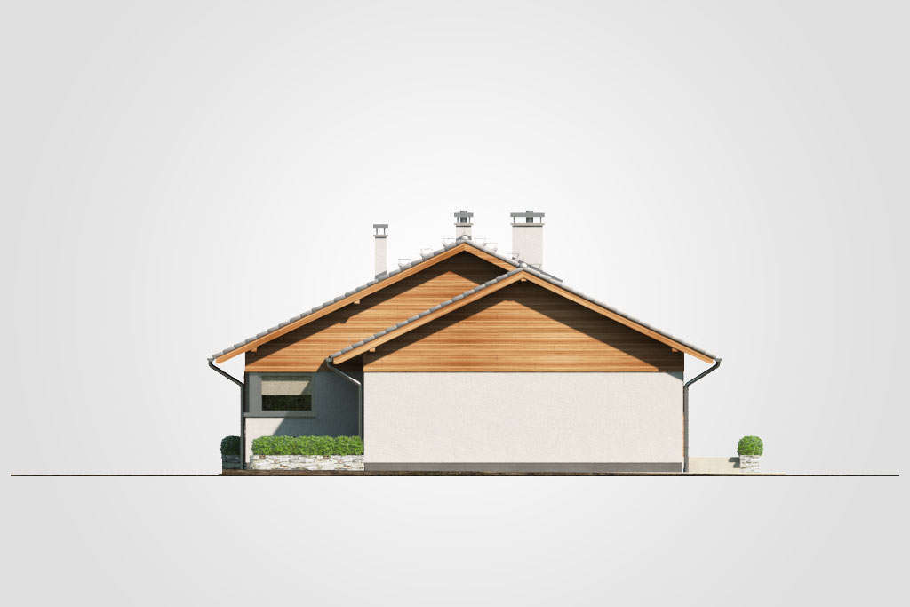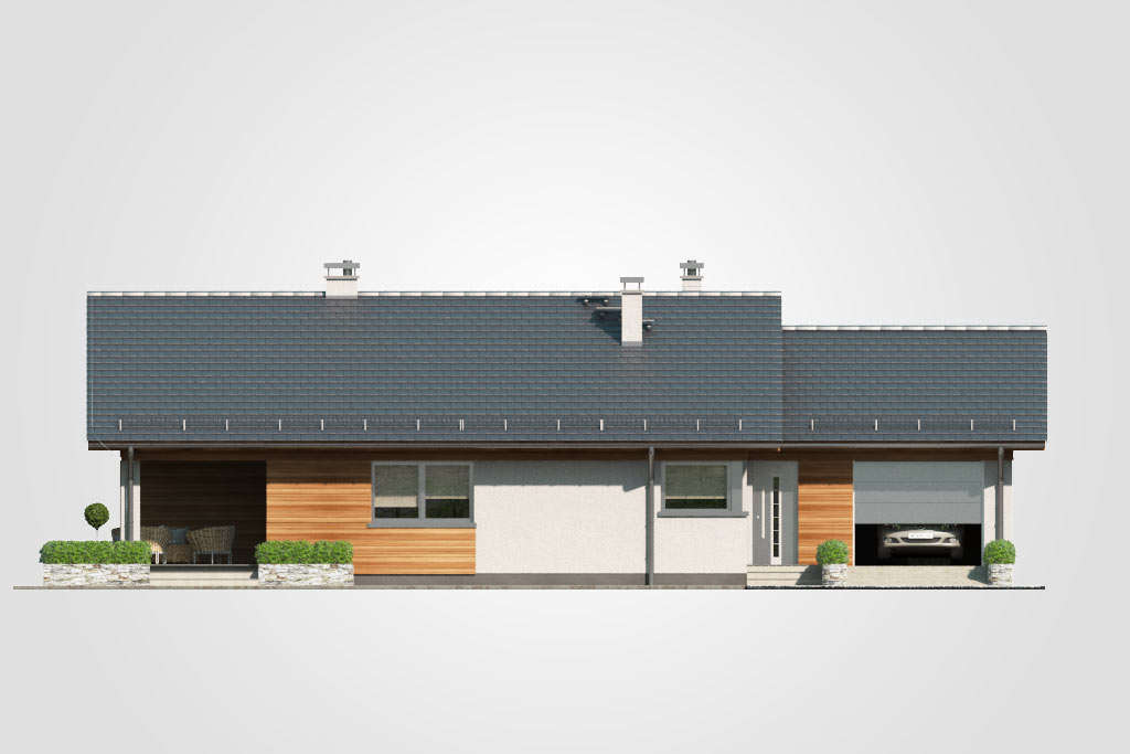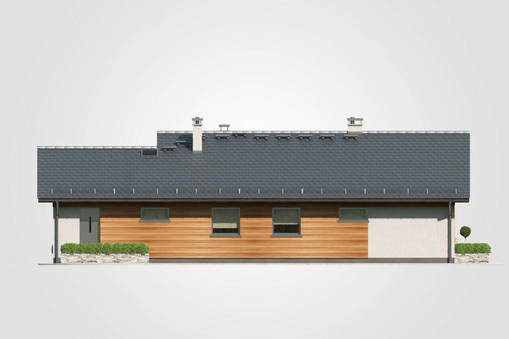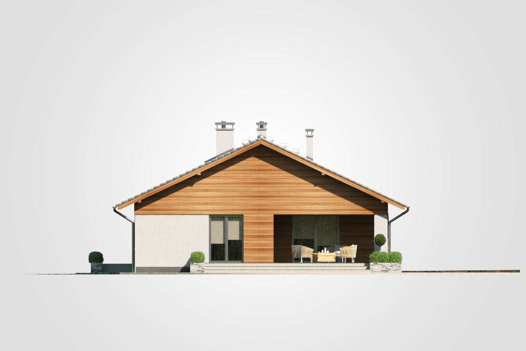 Ova jednostavna kuća zanimljiv je prijedlog za parcele sa ulazom s juga ili zapada, namjenjena četveročlanoj obitelji. Prostor dnevnog djela sadrži kuhinju sa ostavom i dnevni boravak u kojem je dizajniran kamin. Noćna zona sastoji se od tri spavaće sobe i dvije kupaonice. Tu je i velika terasa kojoj se može pristupiti iz dnevnog boravka. Hladni tonovi kuće idu ruku pod ruku s drvenom oplatom na dijelu fasade.