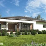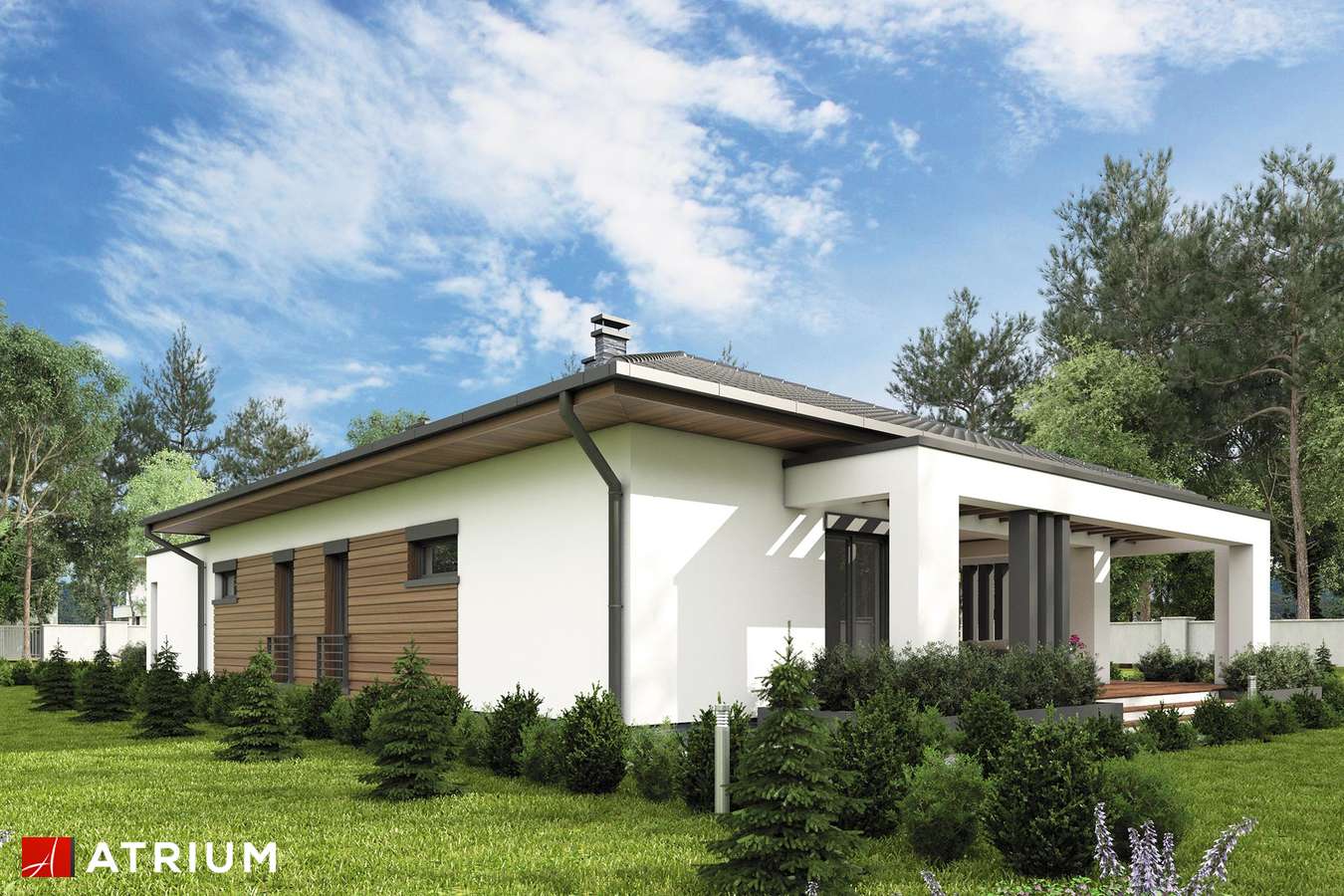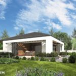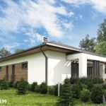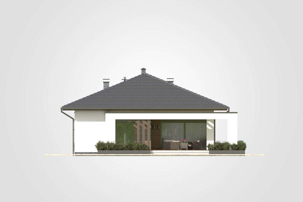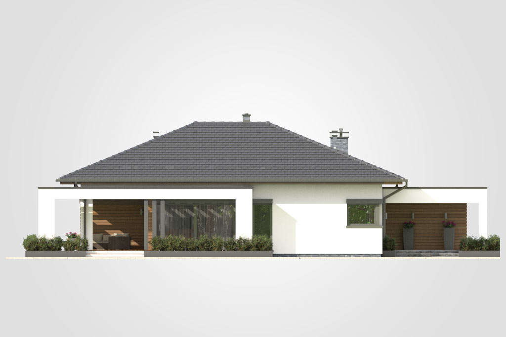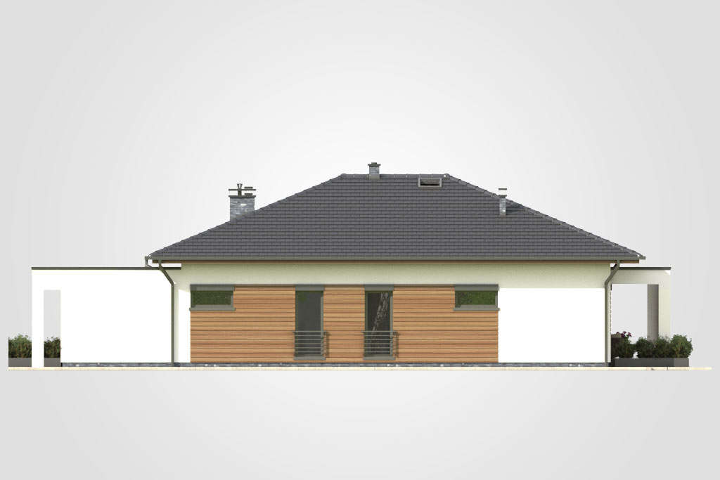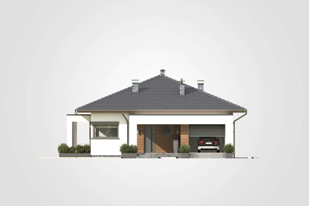 Elegantan i originalan dizajn prizemne kuće s garažom za jedno vozilo koja je integrirana u tijelo zgrade. Kosi krov s malim kutom nagiba koji se proteže znatno izvan lica vanjskih zidova, zajedno s prostranom, djelomično natkrivenom terasom i velikim ostakljenim površinama savršeno se uklapa u trendove moderne gradnje. Hladne boje fasade, uravnotežene toplim drvenim naglascima, stvaraju skladnu kompoziciju dajući cjelini jedinstveni karakter. Dnevna zona uključuje svijetlu dnevnu sobu, kuhinju s praktičnom ostavom, udobnu blagovaonicu i kupaonicu. Noćna zona sastoji se od tri spavaće sobe s kupaonicom. Pažnju privlači atraktivno rekreacijsko područje koje stvara prostrana terasa sa zanimljivo dizajniranim krovom koji ima dekorativnu funkciju, a dodatno štiti od prekomjerne sunčeve svjetlosti. Cjelinu nadopunjuju zanimljive karakteristične pergole smještene na terasi i prednjem dijelu kuće. Bezvremenski izgled zgrade savršeno će se uklopiti na gradske i prigradske parcele.