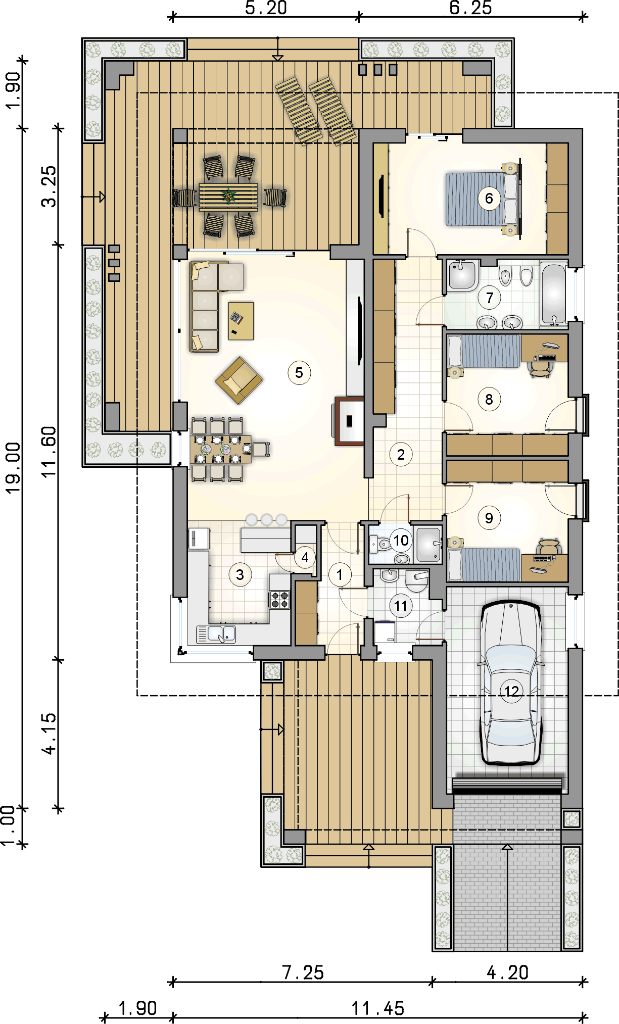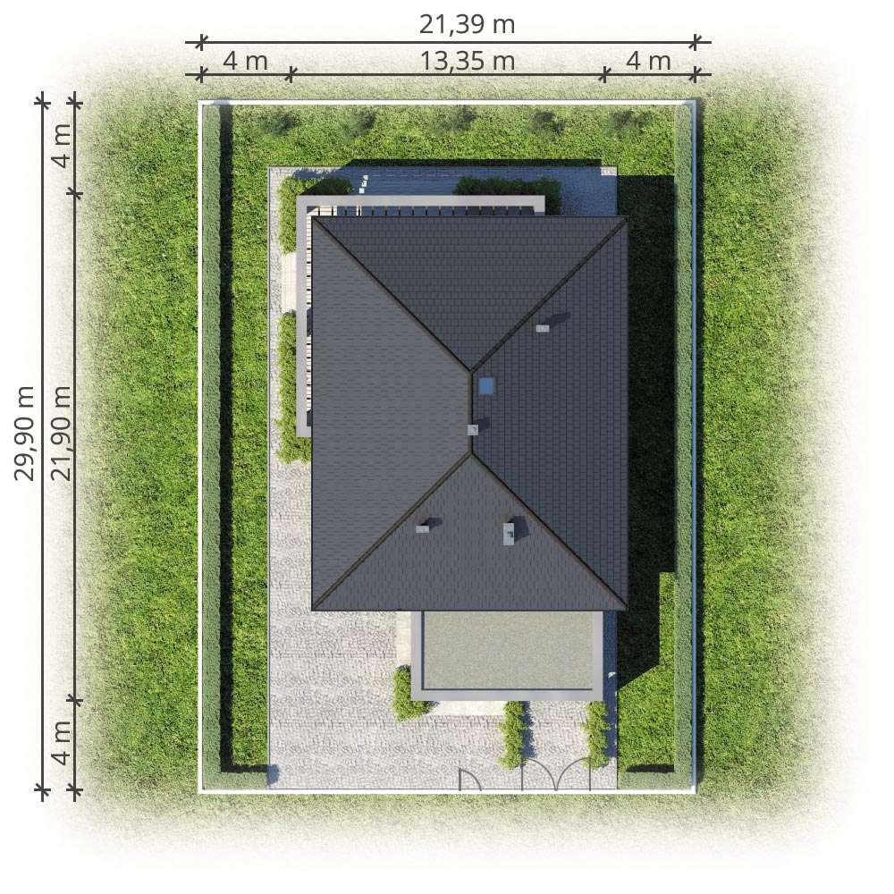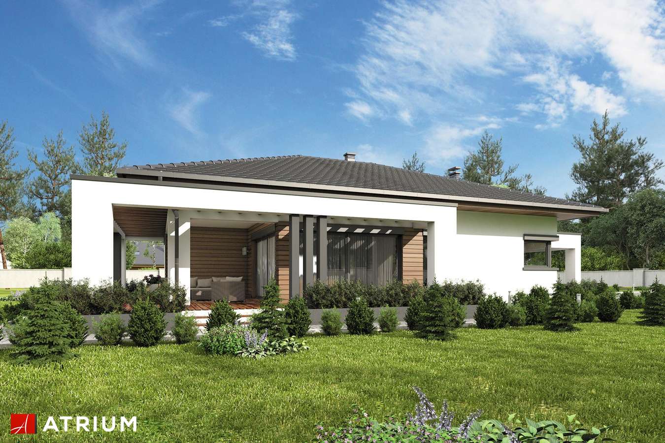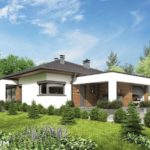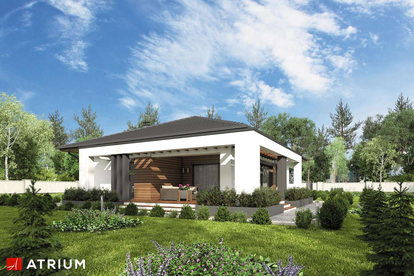 Elegantan i originalan dizajn prizemne kuće s garažom za jedno vozilo koja je integrirana u tijelo zgrade. Kosi krov s malim kutom nagiba koji se proteže znatno izvan lica vanjskih zidova, zajedno s prostranom, djelomično natkrivenom terasom i velikim ostakljenim površinama savršeno se uklapa u trendove moderne gradnje. Hladne boje fasade, uravnotežene toplim drvenim naglascima, stvaraju skladnu kompoziciju dajući cjelini jedinstveni karakter. Dnevna zona uključuje svijetlu dnevnu sobu, kuhinju s praktičnom ostavom, udobnu blagovaonicu i kupaonicu. Noćna zona sastoji se od tri spavaće sobe s kupaonicom. Pažnju privlači atraktivno rekreacijsko područje koje stvara prostrana terasa sa zanimljivo dizajniranim krovom koji ima dekorativnu funkciju, a dodatno štiti od prekomjerne sunčeve svjetlosti. Cjelinu nadopunjuju zanimljive karakteristične pergole smještene na terasi i prednjem dijelu kuće. Bezvremenski izgled zgrade savršeno će se uklopiti na gradske i prigradske parcele.