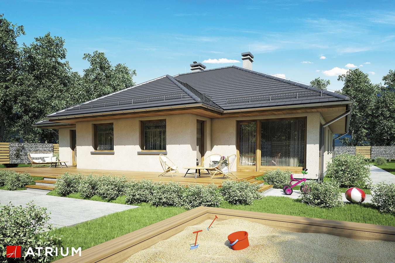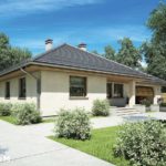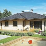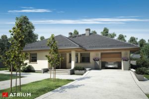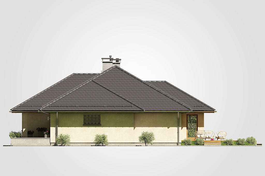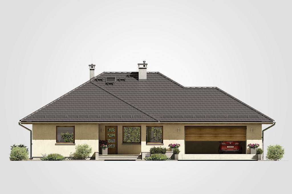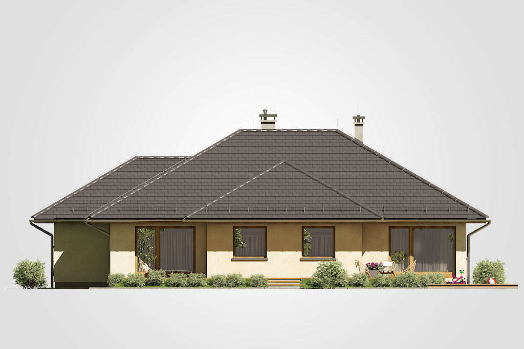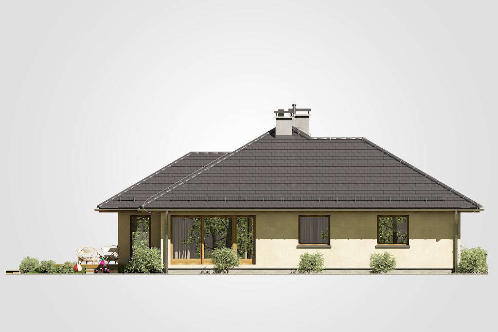 Elegantni dizajn prizemnice idealne za obitelj 2 plus 2, s dodatnom sobom koja ovisno o situaciji, može djelovati kao radna soba ili soba za goste. Tri spavaće sobe su smještene u stražnjem dijelu zgrade, stvarajući tako intiman prostor za spavanje. Iz svake od njih izaći ćete na ogromnu terasu za odmor koja se nalazi u stražnjem dijelu kuće. U središnjem dijelu kuće nalazi se velika kupaonica s kadom i tuš-kabinom. Dnevna soba s blagovaonicom je veliki prostor s kaminom i izlazom na terasu. Kuća je prekrivena bezvremenskim, uvijek elegantnim viševodnim krovom koji stvara funkcionalnu nastrešnicu nad ulazom u kuću.