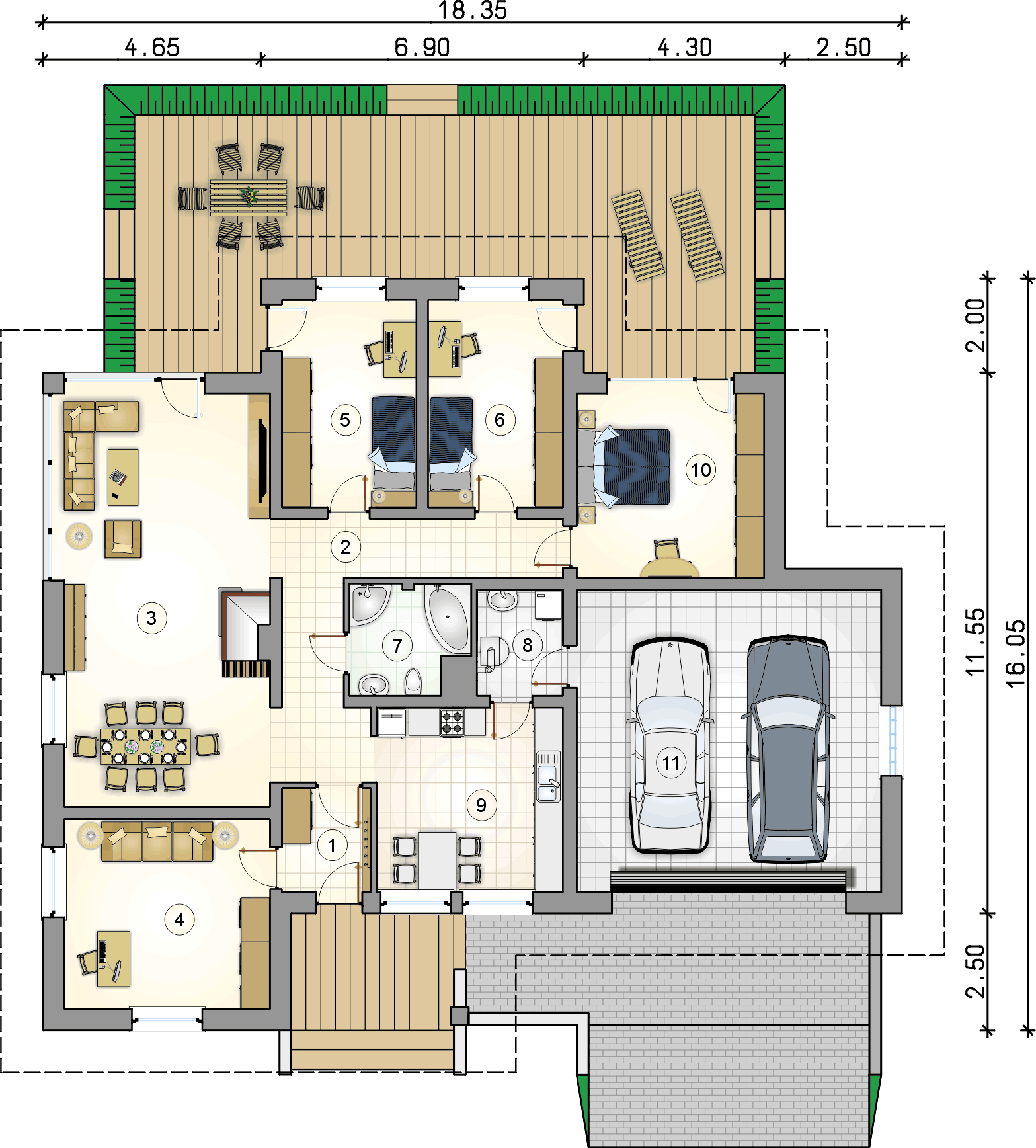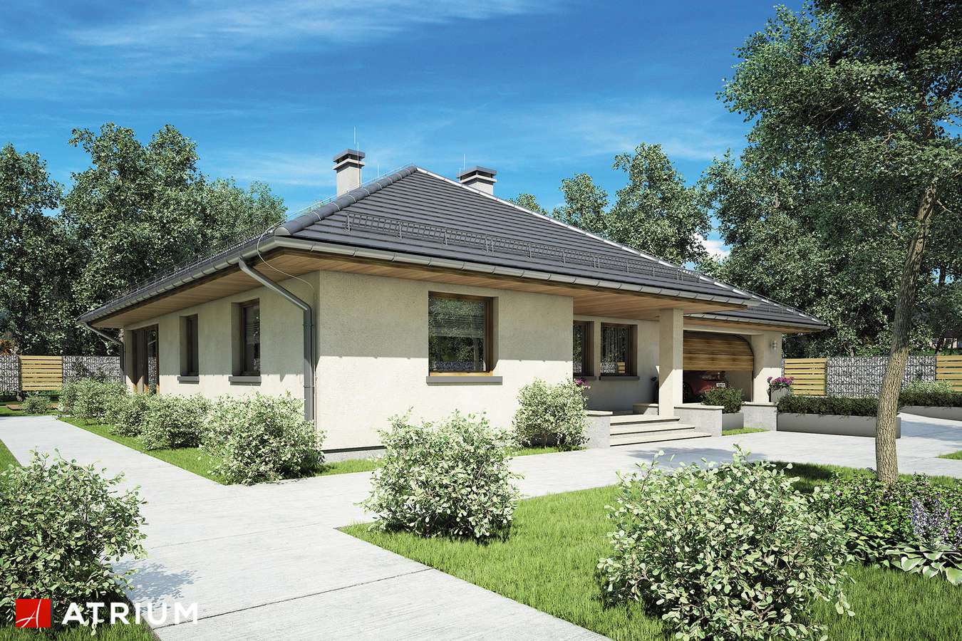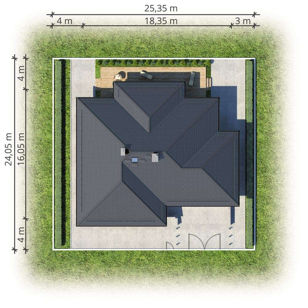 Elegantni dizajn prizemnice idealne za obitelj 2 plus 2, s dodatnom sobom koja ovisno o situaciji, može djelovati kao radna soba ili soba za goste. Tri spavaće sobe su smještene u stražnjem dijelu zgrade, stvarajući tako intiman prostor za spavanje. Iz svake od njih izaći ćete na ogromnu terasu za odmor koja se nalazi u stražnjem dijelu kuće. U središnjem dijelu kuće nalazi se velika kupaonica s kadom i tuš-kabinom. Dnevna soba s blagovaonicom je veliki prostor s kaminom i izlazom na terasu. Kuća je prekrivena bezvremenskim, uvijek elegantnim viševodnim krovom koji stvara funkcionalnu nastrešnicu nad ulazom u kuću.